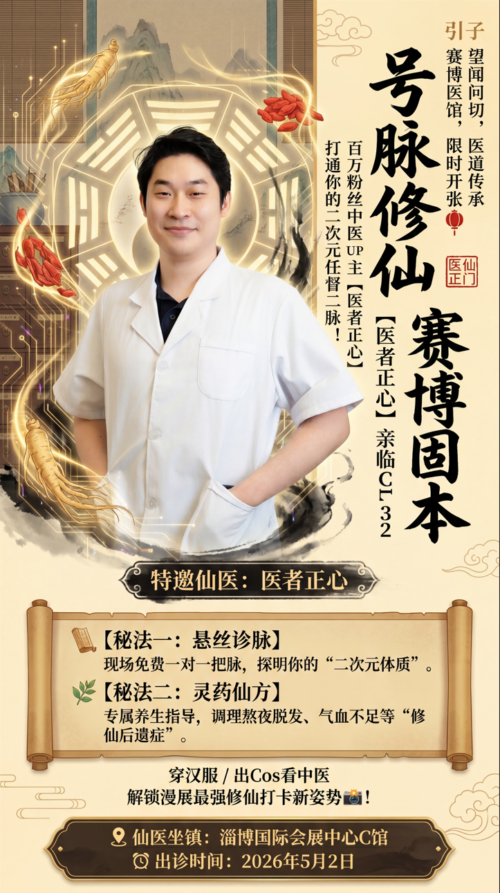全网超有人气的百万粉丝中医UP主 @医者正心 老师,即将在五一空降咱们淄博CL32漫展现场!🔥